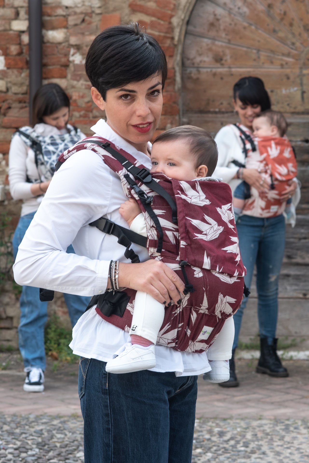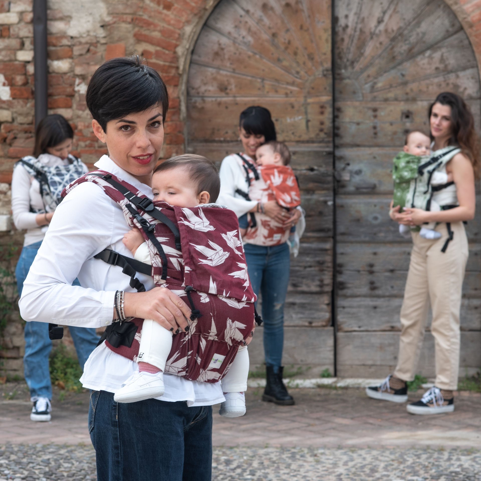 Huggy Nest Baby Size Full Buckle Carriers are fully adjustable carriers that can be used from birth onwards. Full Buckles are created from top quality Huggyberry woven wraps with their perfect combination of softness and sturdiness. The fit of the carrier is created by a babywearing consultant who worked (and continues to work) day and night, closely with local and international babywearing communities and consultants to come up with the perfect fit and adjustability range. The padding in shoulder pads and waistbelt is both durable enough to make you feel comfortable at long walks carrying a heavier child; and cushiony enough to avoid the pressure of the weight.