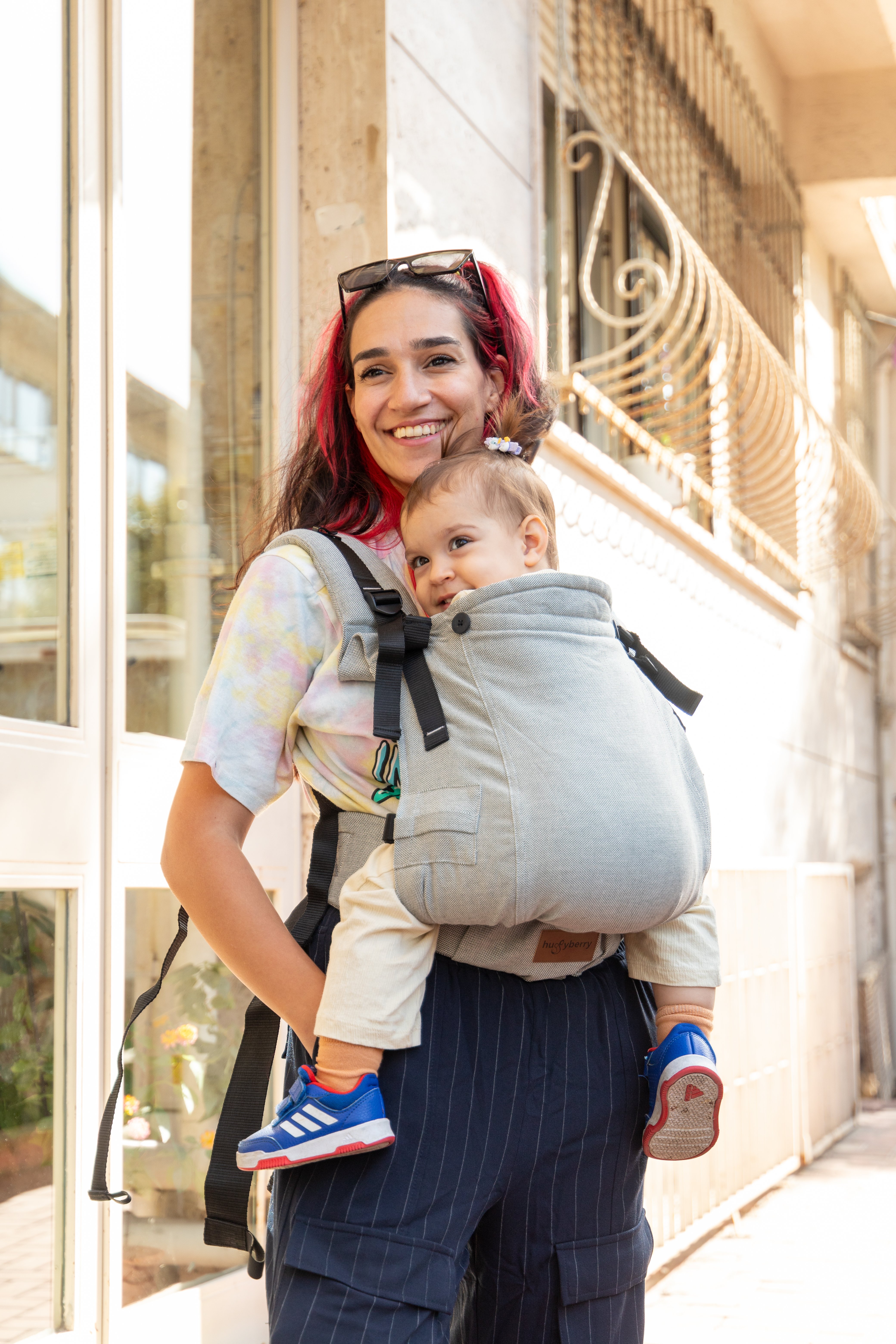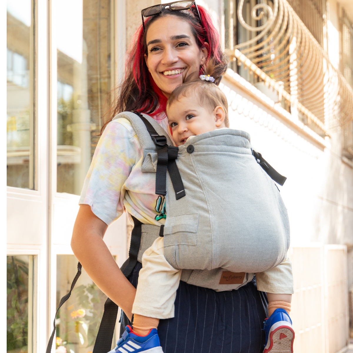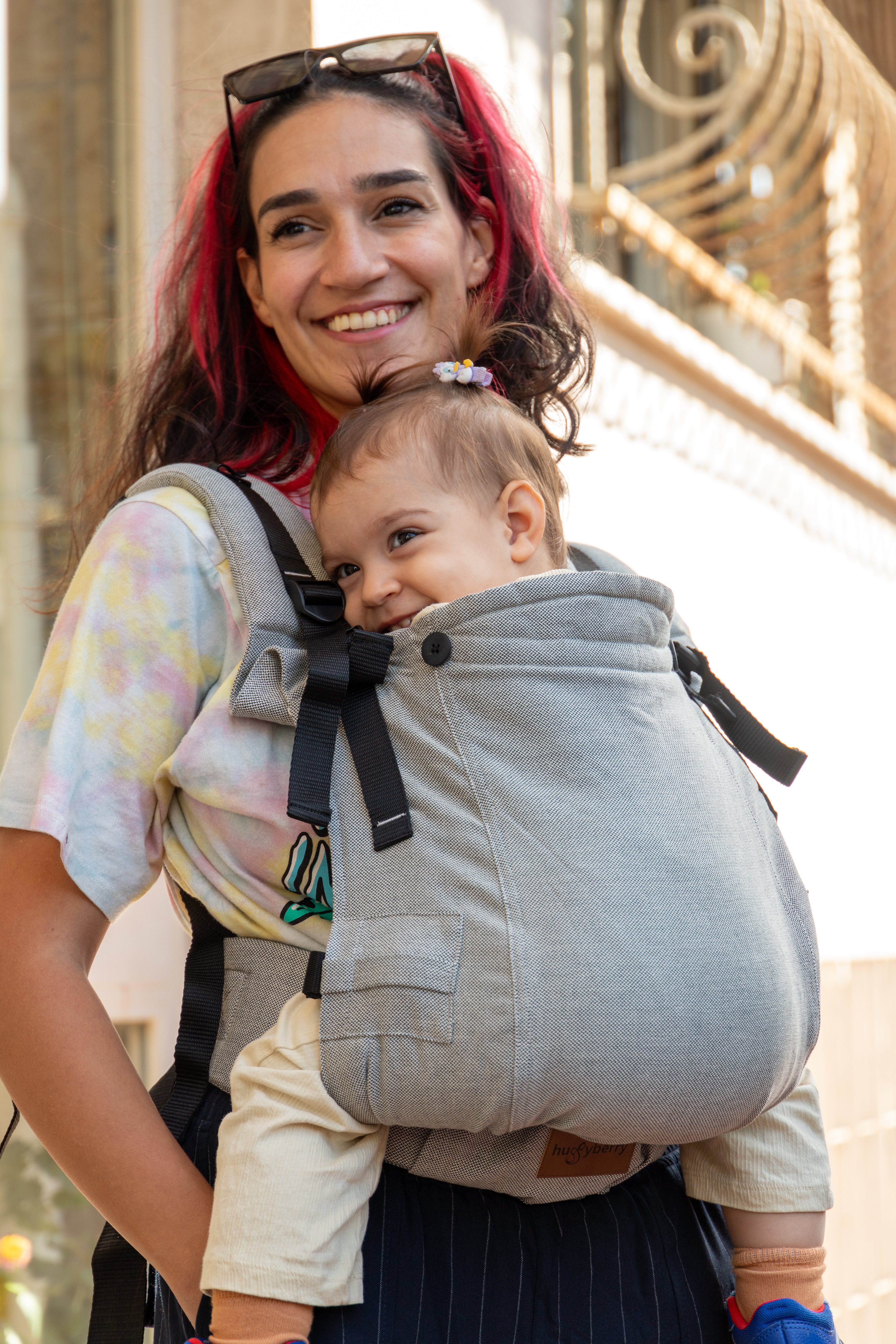 Huggy Plus Toddler Size Full Buckle Carriers are exactly what you need! Did you decided to wait until your baby is a few months old before you want to try a carrier? Did you started with a strechy wrap and now that your little one has grown it doesn't fit anaymore? You can't really buy a regular toddler or pre-schooler size carrier since they are way too big for your little one? We've heard you and createdthe perfect carrier for your needs.