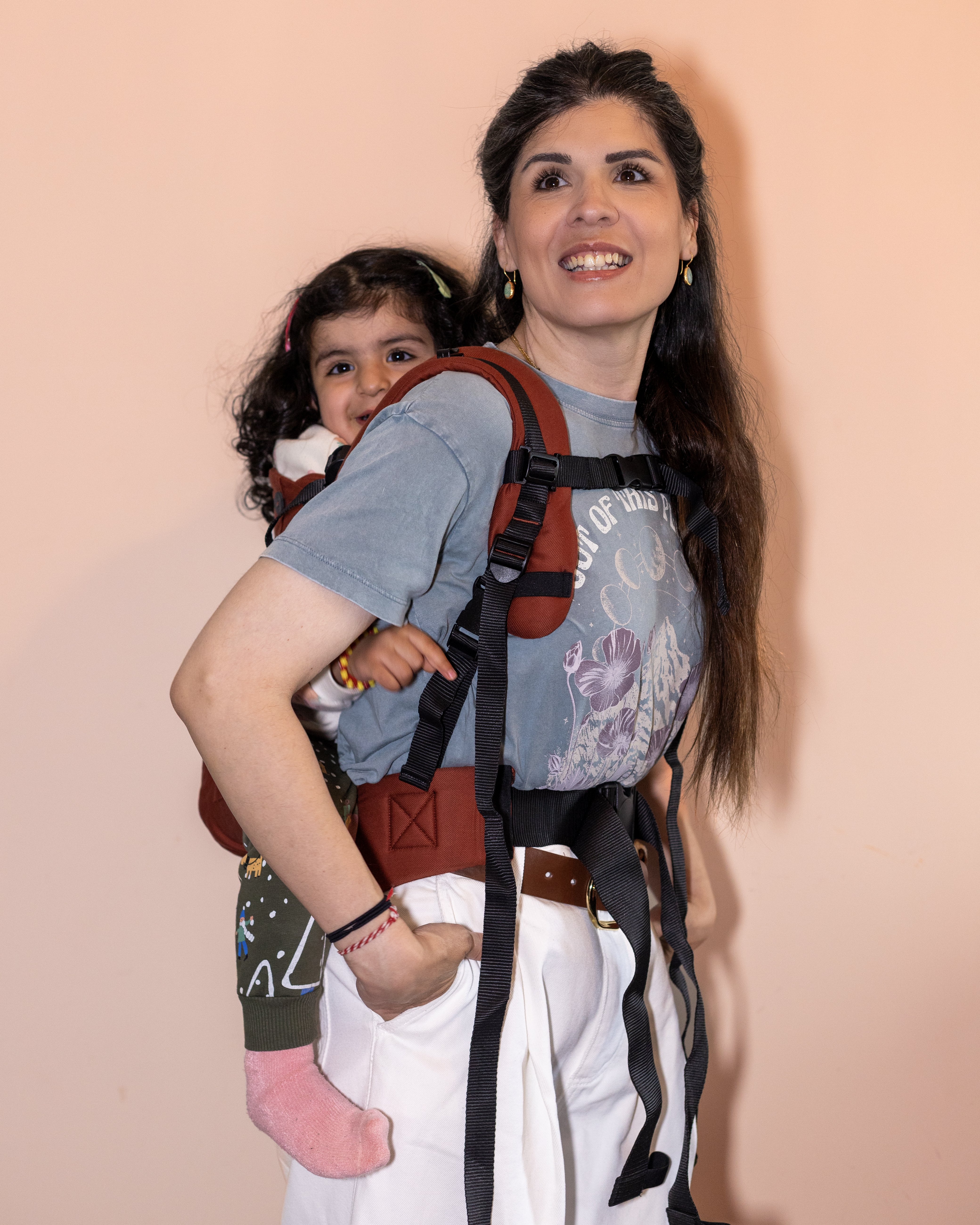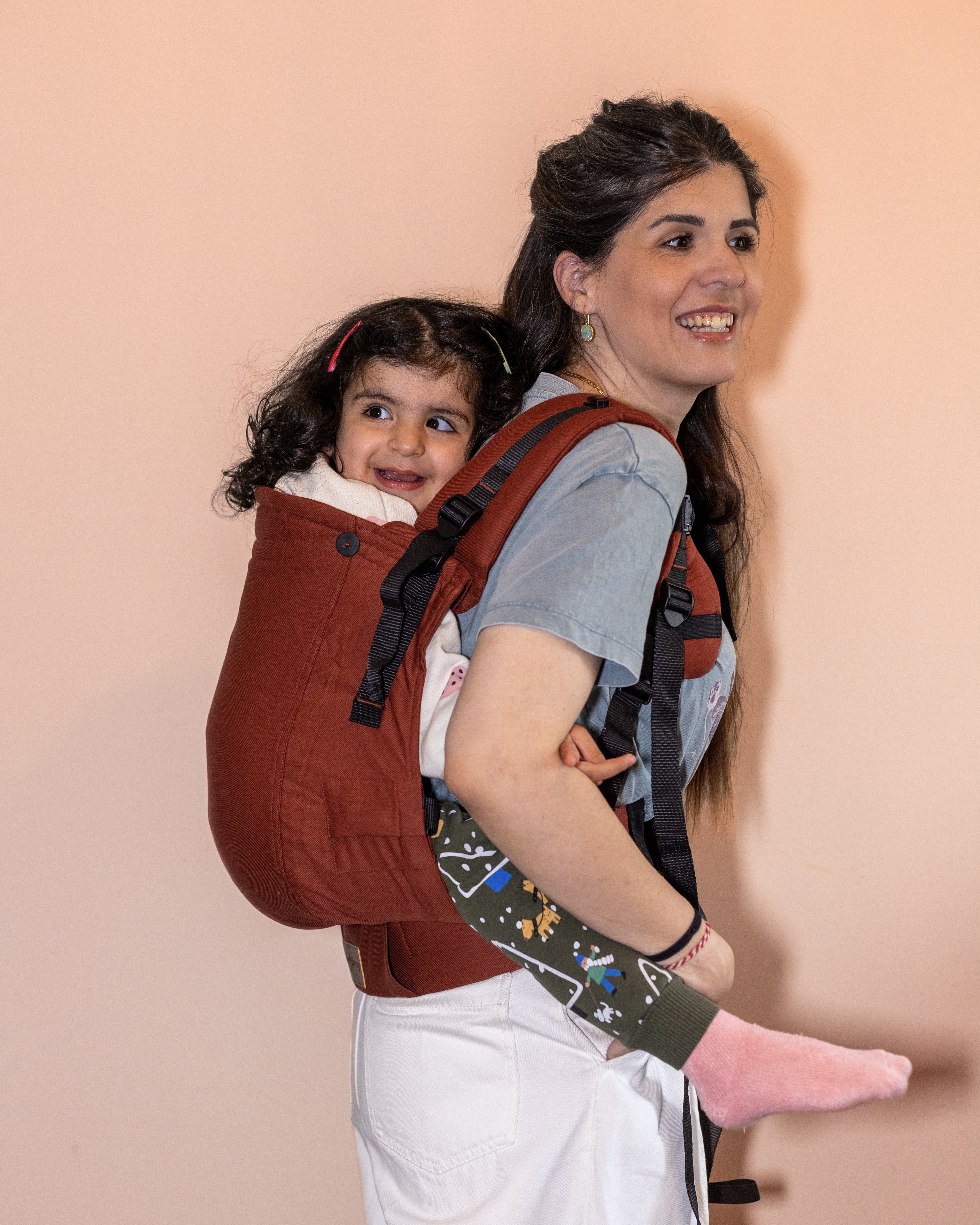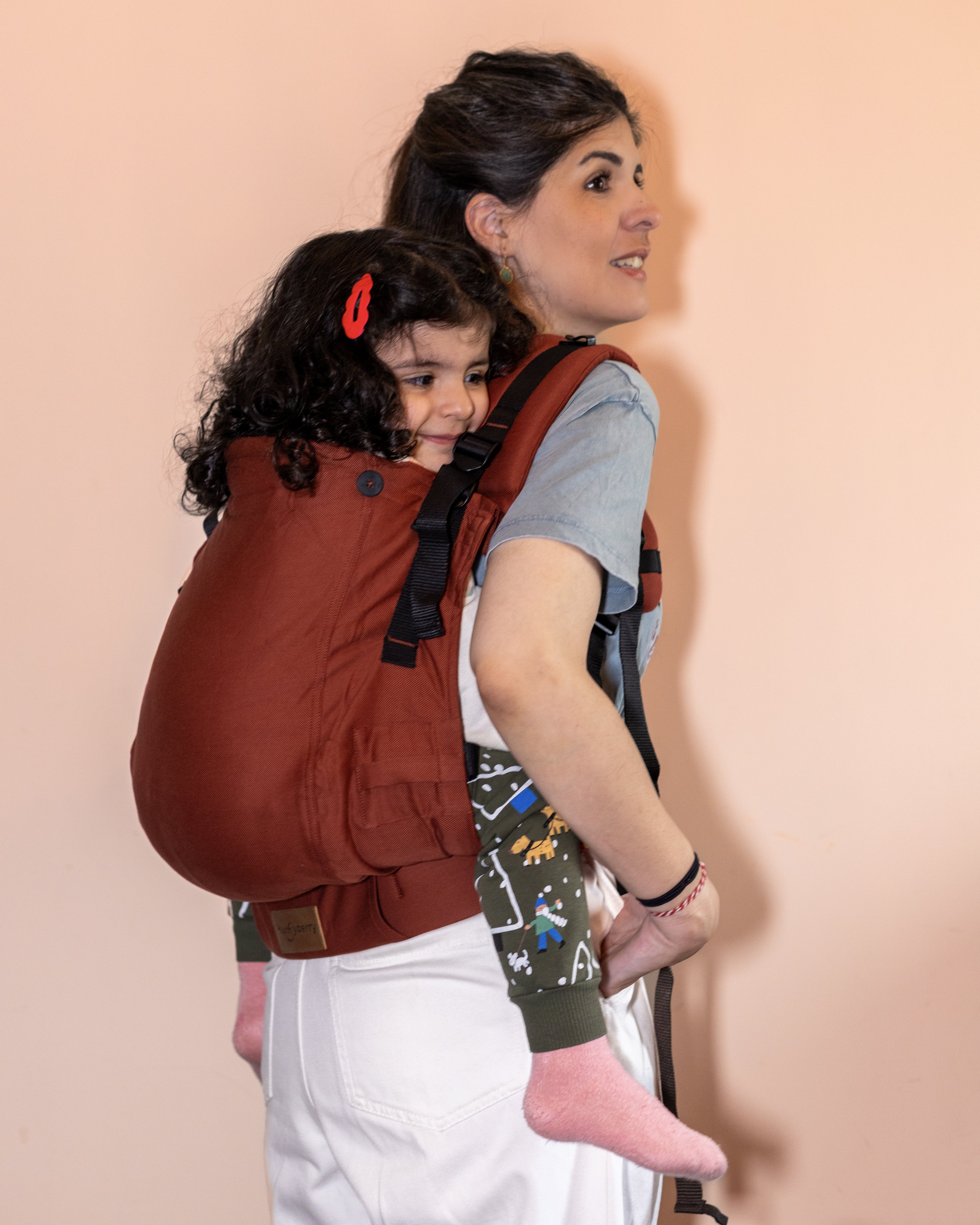 Huggy Plus Toddler Size Full Buckle Carriers are exactly what you need! Did you decided to wait until your baby is a few months old before you want to try a carrier? Did you started with a strechy wrap and now that your little one has grown it doesn't fit anaymore? You can't really buy a regular toddler or pre-schooler size carrier since they are way too big for your little one? We've heard you and createdthe perfect carrier for your needs.