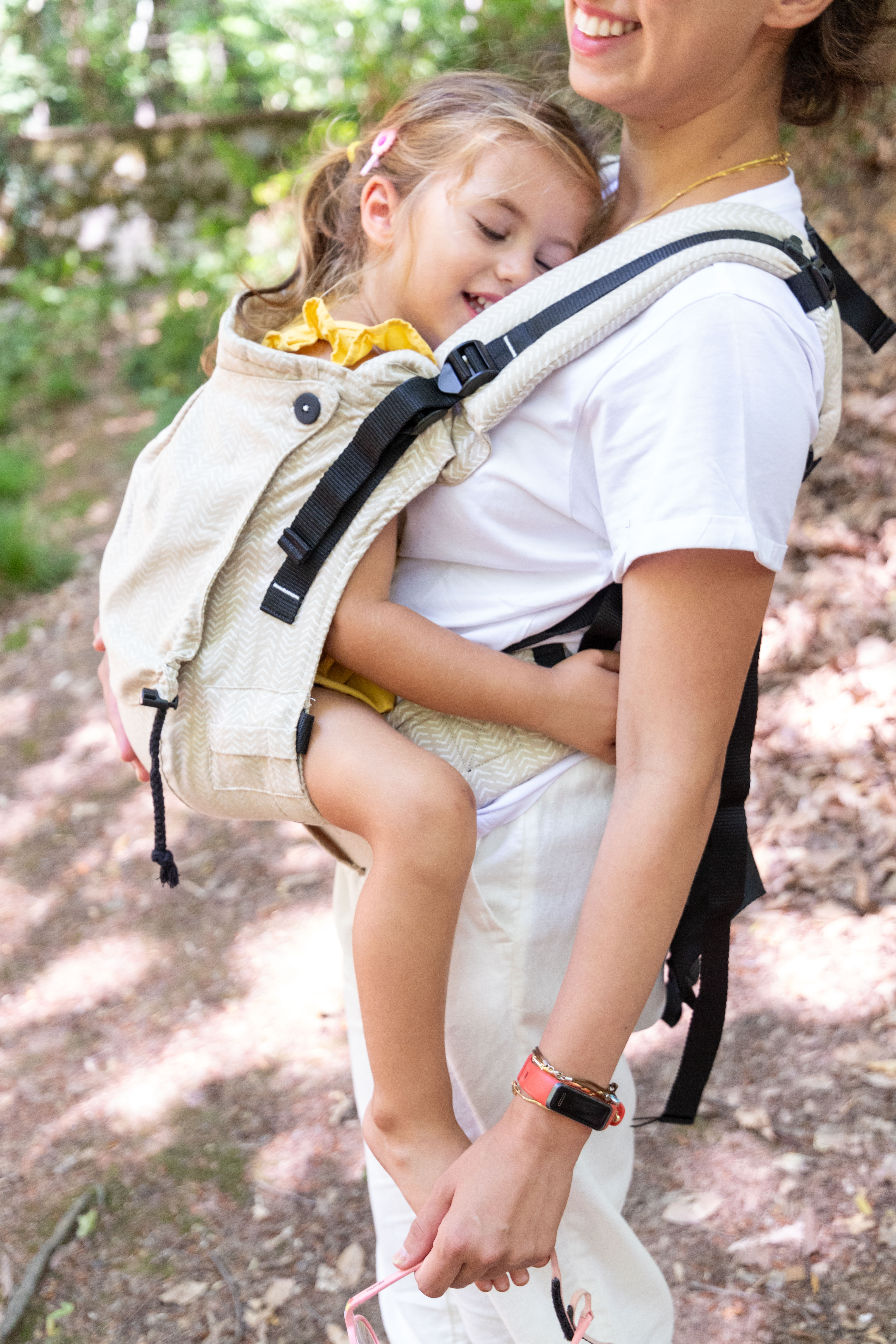 Huggy Plus Toddler Size Full Buckle Carriers are exactly what you need! Did you decided to wait until your baby is a few months old before you want to try a carrier? Did you started with a strechy wrap and now that your little one has grown it doesn't fit anaymore? You can't really buy a regular toddler or pre-schooler size carrier since they are way too big for your little one? We've heard you and createdthe perfect carrier for your needs.